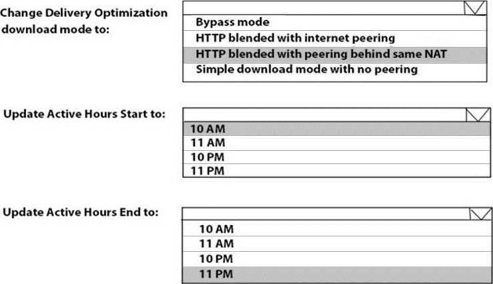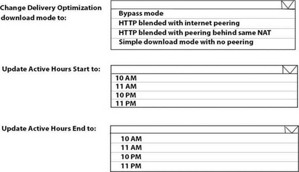 How should you configure the update settings? To answer, select the appropriate options in the answer area. NOTE: Each correct selection is worth one point.