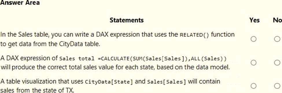 You are creating a Microsoft Power Bl model that has two tables named CityData and Sales.