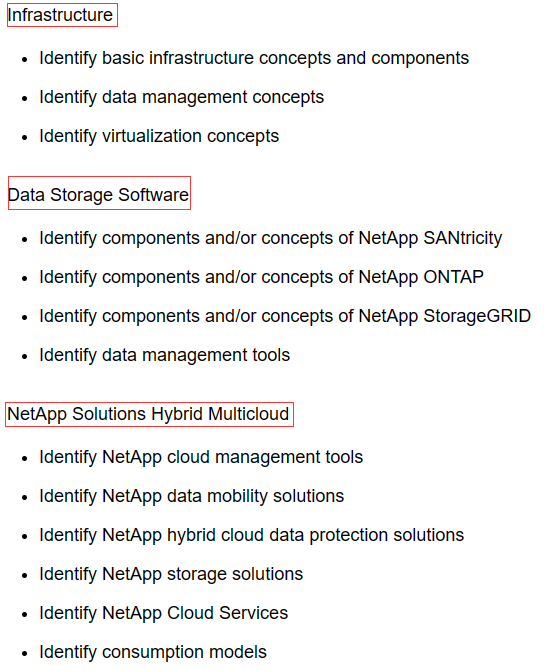 The actual Network Appliance NS0-004 exam covers three key areas: Infrastructure, Data Storage Software, and NetApp Data Fabric Solutions.